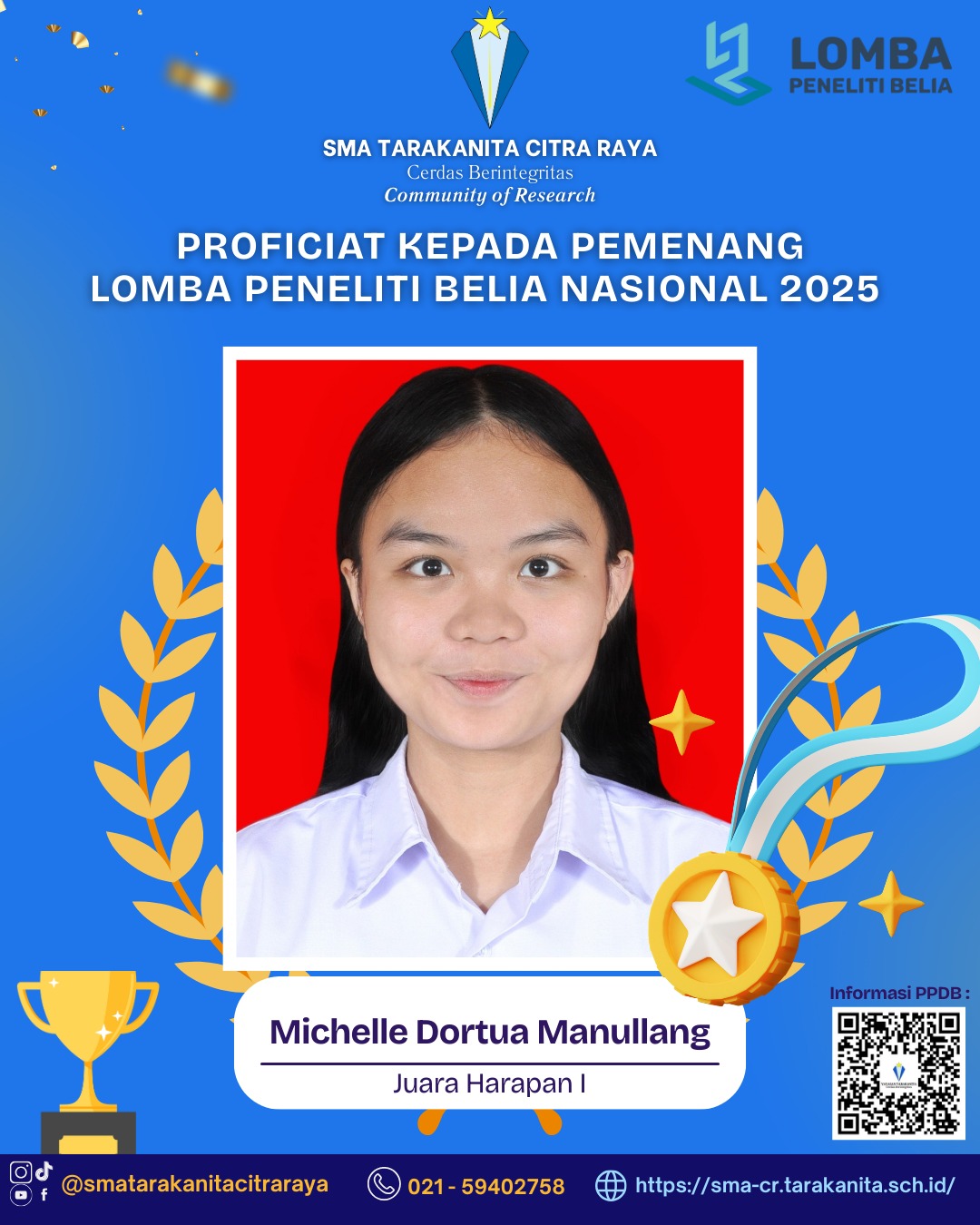 Proficiat untuk Michelle Dortua Manullang Juara Harapan I dalam Lomba Peneliti Belia Nasional 2025.