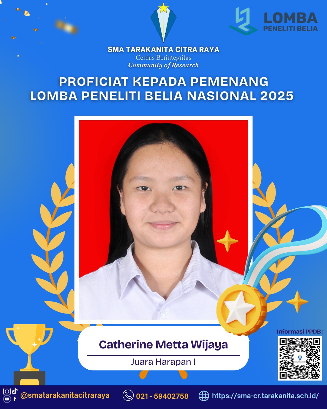 Proficiat untuk Catherine Metta Wijaya Juara Harapan I dalam Lomba Peneliti Belia Nasional 2025.